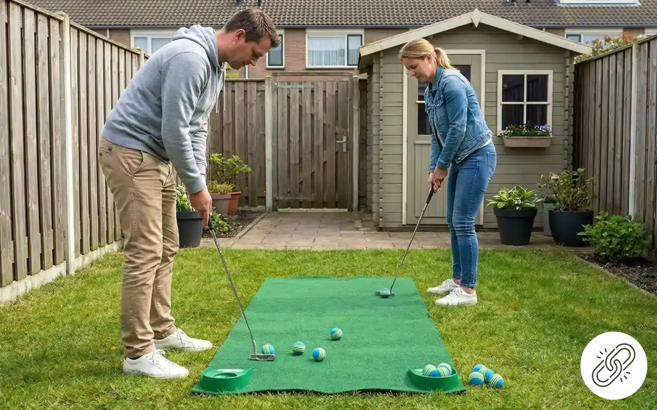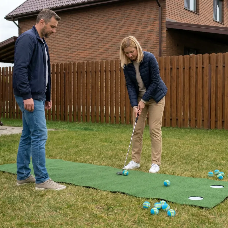 Voin harjoitella golfsvingiäni sisällä ilman melua tai vahinkoja. Kirkkaat raidat auttavat löytämään pallot pihalta harjoittelun jälkeen.