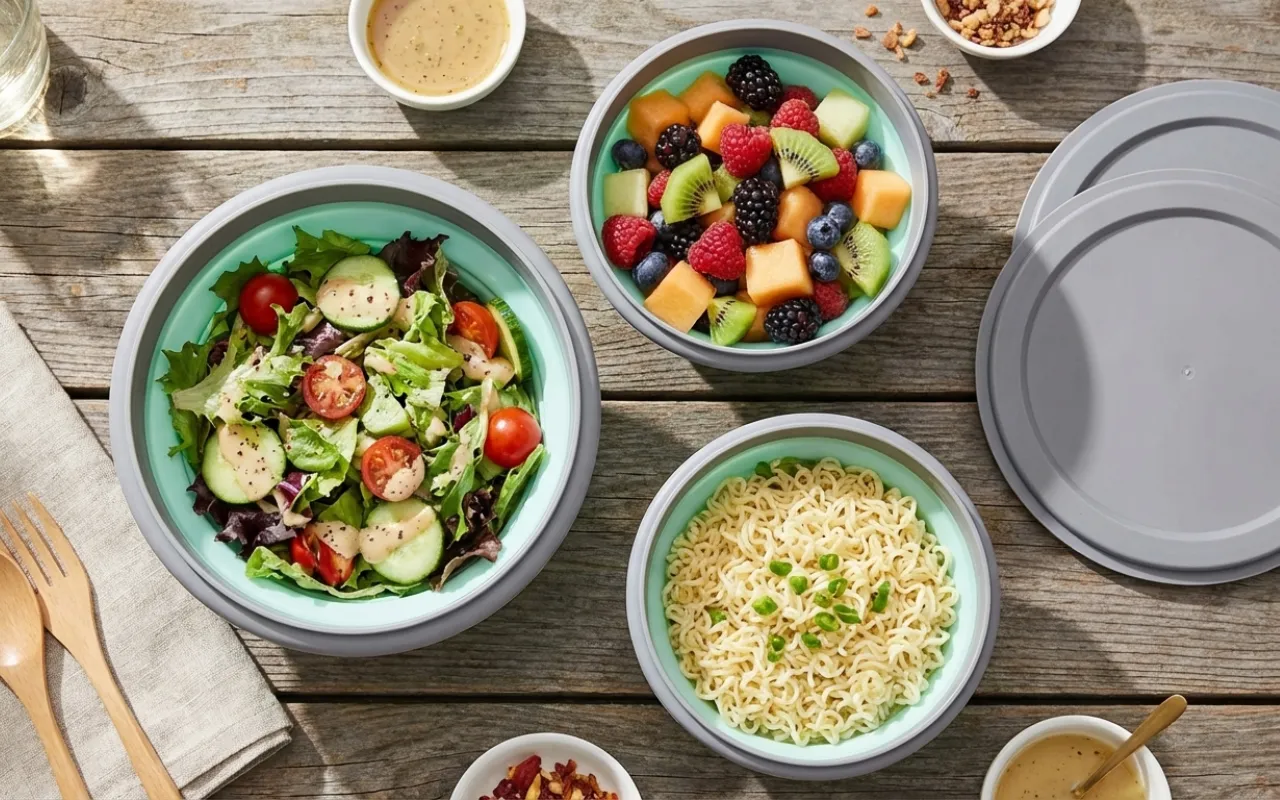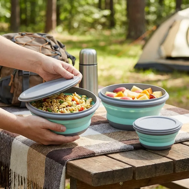 Veimme silikonikulhot musiikkifestareille. Ne kestivät kuuman ramenin ja taittuivat sitten litteiksi taskuun. Ei enää kömpelöitä muovirasiapinoja mukana.