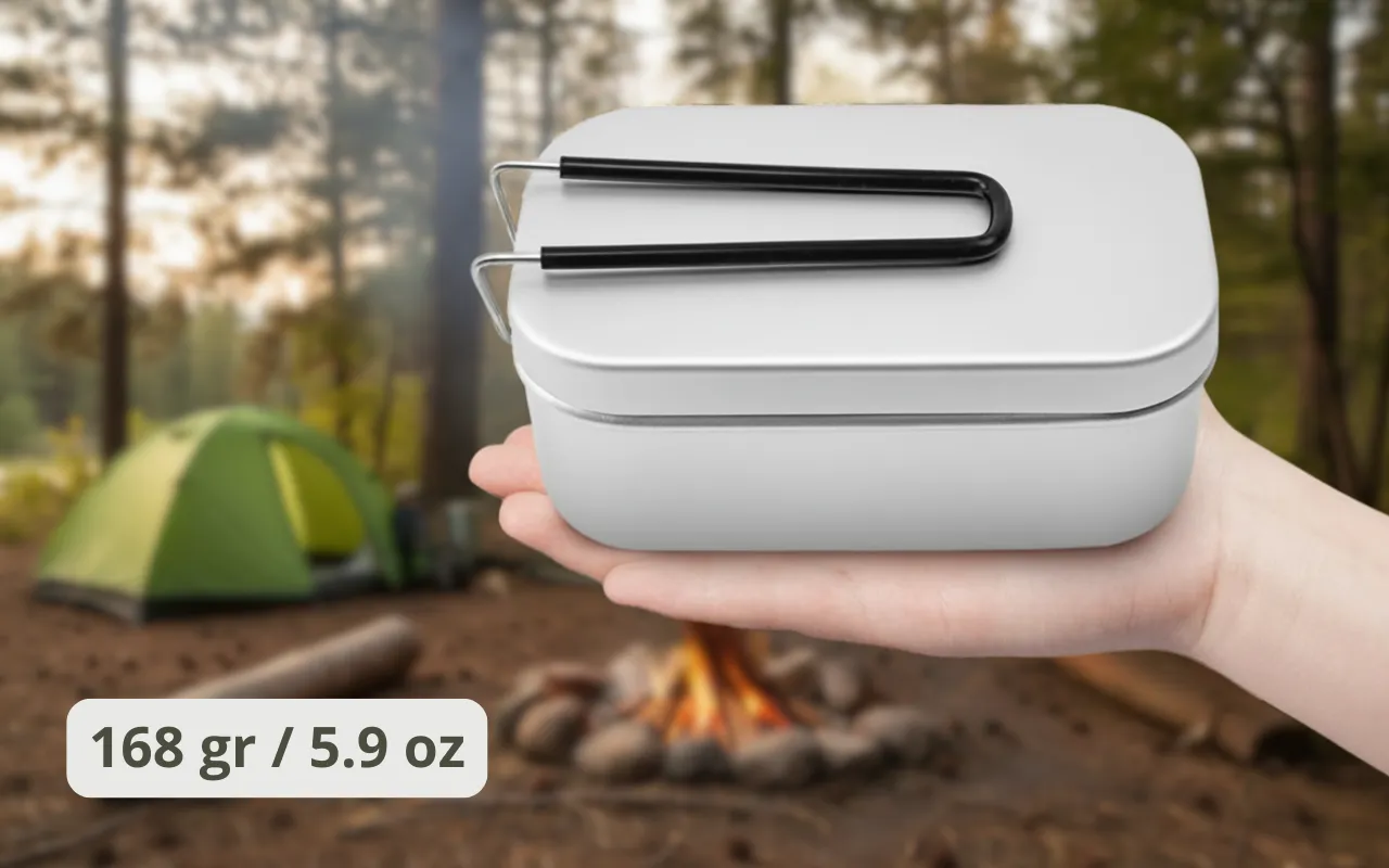 Threo Mess Tin käyttää luotettavia materiaaleja terveytesi vuoksi. Sen tukeva rakenne kestää ulkokäytön huoletta.