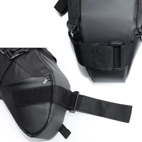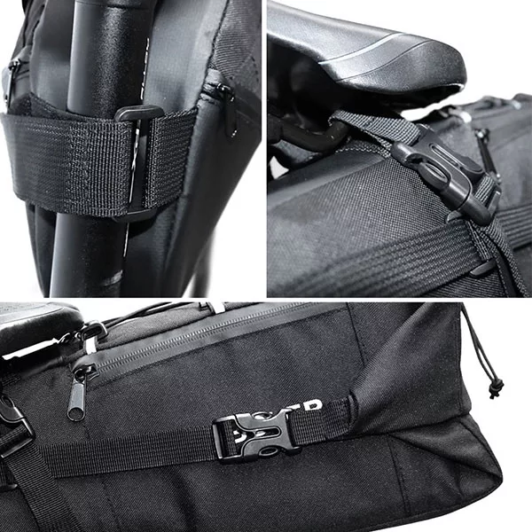 Sen päivitetty satulakiinnitysjärjestelmä yhdessä puristusremmien kanssa vähentää heilumista. Näin tämä pyörälaukku vähentää pomppimista ja tarjoaa mukavan ajon pitkillä matkoilla. Lisäksi tämä satulalaukku käyttää kätevää kiinnitysmenetelmää. Satulatolpan remmi on tukeva tarranauha, ja siinä on kaksi yläremmiä. Yksi remmi kiinnitetään satulatolpan ympärille ja kaksi muuta pujotetaan satulakiskojen läpi. Näin viimeiset kaksi remmiä on helppo kiristää vetämällä niiden päistä.