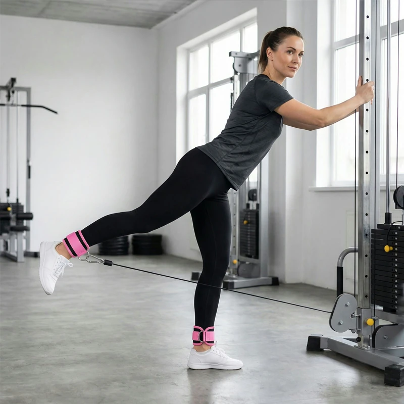 Kuntoutan polveani ja käytän tätä remmiä kevyissä kaapeliliikkeissä. Tuki tuntuu vakaalta, joten voin keskittyä sulavaan liikkeeseen enkä nilkkaani.