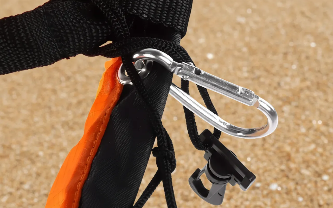 Avaa ja kiinnitä Threo-kajakkipurje sekunneissa tukevilla karabiineilla. Ei työkaluja tai hankalia ohjeita hidastamassa rannalla.