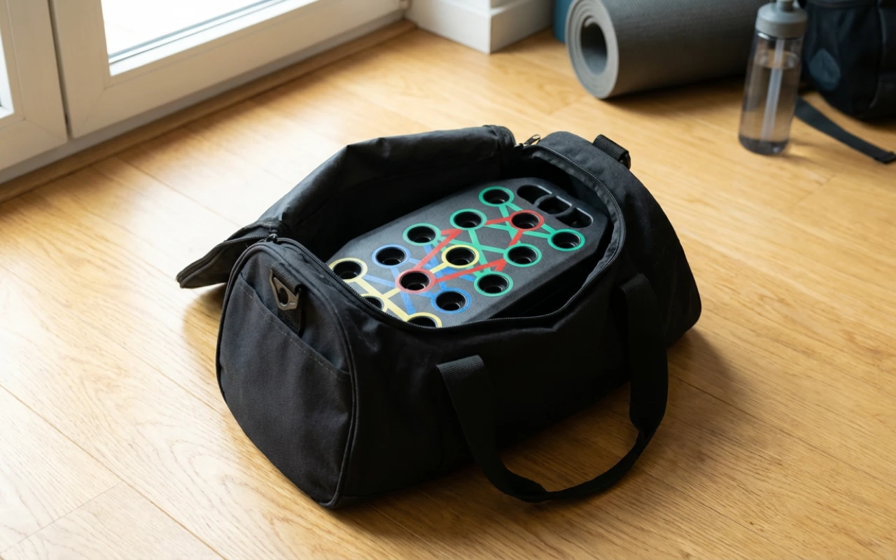 Lauta taittuu nopeasti, joten se mahtuu pieniin huoneisiin tai laukkuihin. Treenaa missä vain ilman huolta tilasta tai raskaista välineistä.