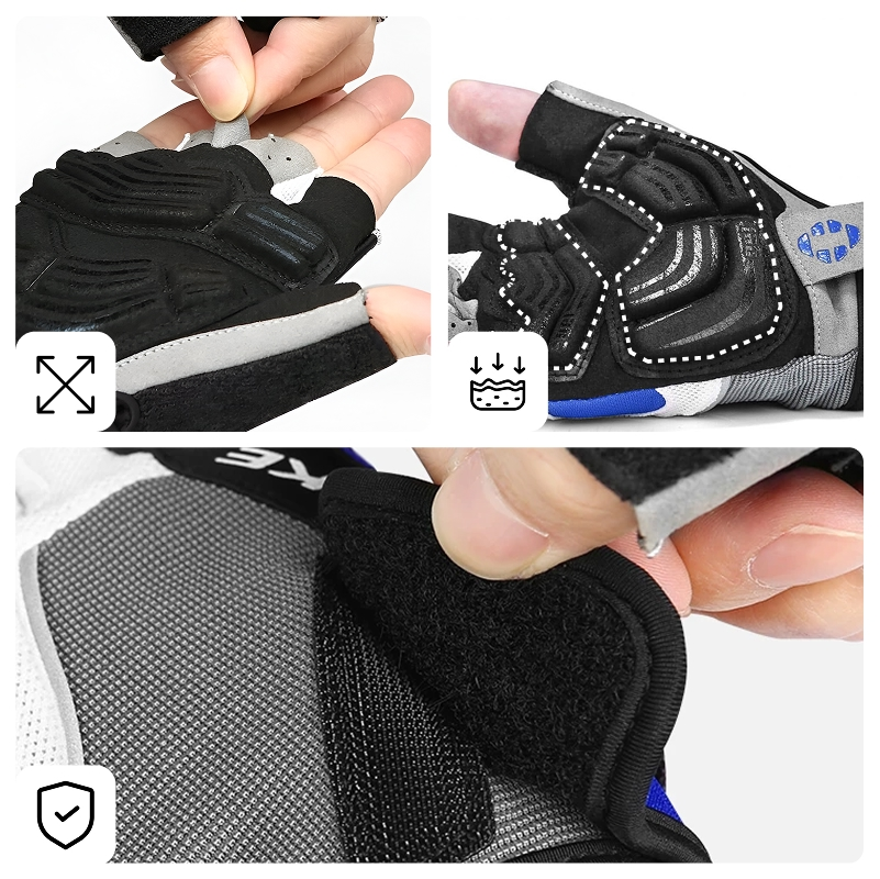 Velcro-rannekiristyksen avulla voit helposti säätää käsineiden tiukkuutta parhaan istuvuuden varmistamiseksi. Kun ajosi päättyy, irrotuslenkit helpottavat käsineiden riisumista mukavasti. Yksinkertainen mutta tehokas muotoilu sopii täydellisesti pitkän matkan pyöräilyseikkailuihin, kuntoharjoituksiin, vuorikiipeilyyn, veneilyyn, patikointiin, kajakointiin ja muihin ulkoilma-aktiviteetteihin. Nämä sormettomat käsineet sopivat kesään, kevääseen ja syksyyn.