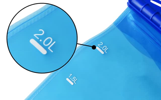 Tilavuusmerkkien avulla voit helposti seurata, kuinka paljon vettä olet juonut ja kuinka paljon sinulla on jäljellä, varmistaen riittävän nesteytyksen koko ulkoilun ajan.