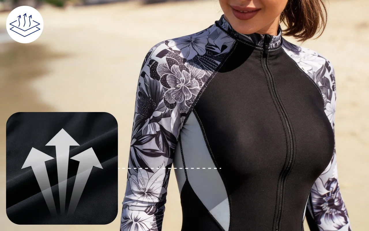Materiaali kuivuu nopeasti jokaisen uinti- tai sukelluskerran jälkeen. Pääset nopeasti takaisin rentoutumaan tai leikkimään tuntematta kylmää tai kosteutta.