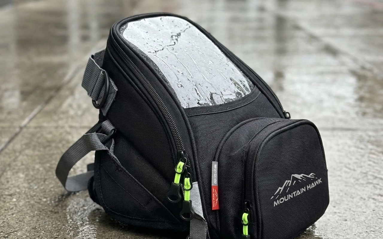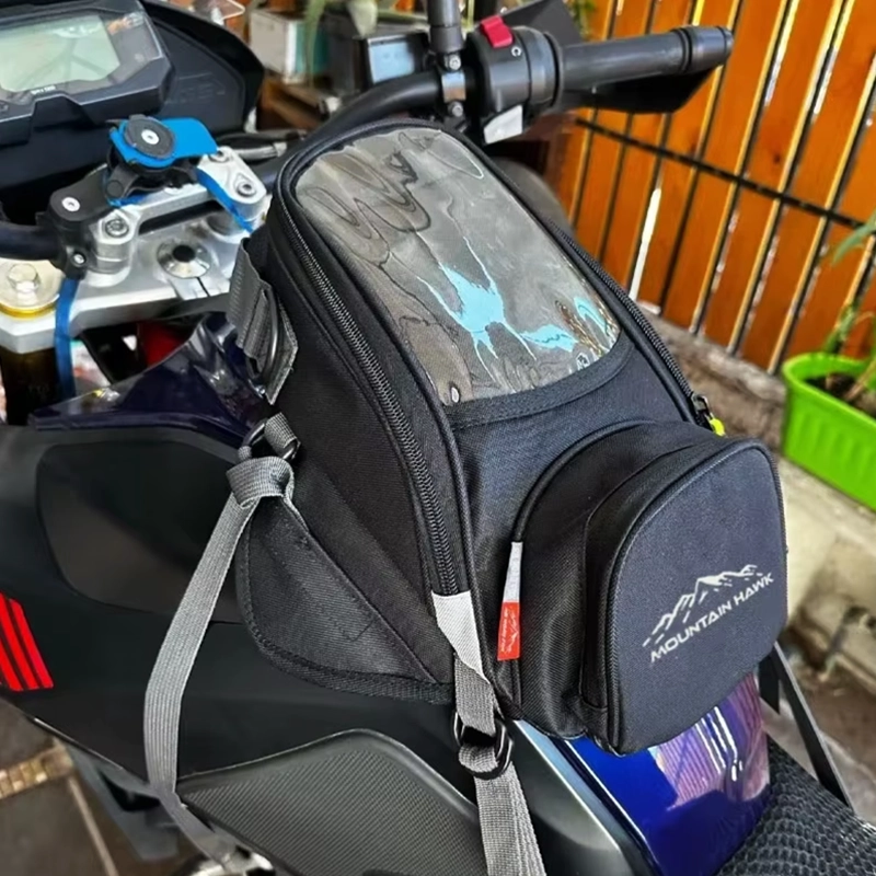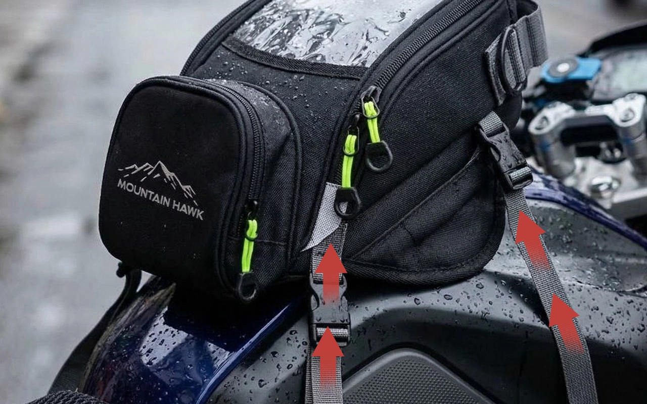Vanha tankkilaukkuni liukui ympäriinsä, mutta tämä pysyy tiukasti paikallaan. Pidän sisällä rengaspainemittaria, vaijerlukkoa ja rekisteriotteen, kaikki siististi järjestyksessä käden ulottuvilla.