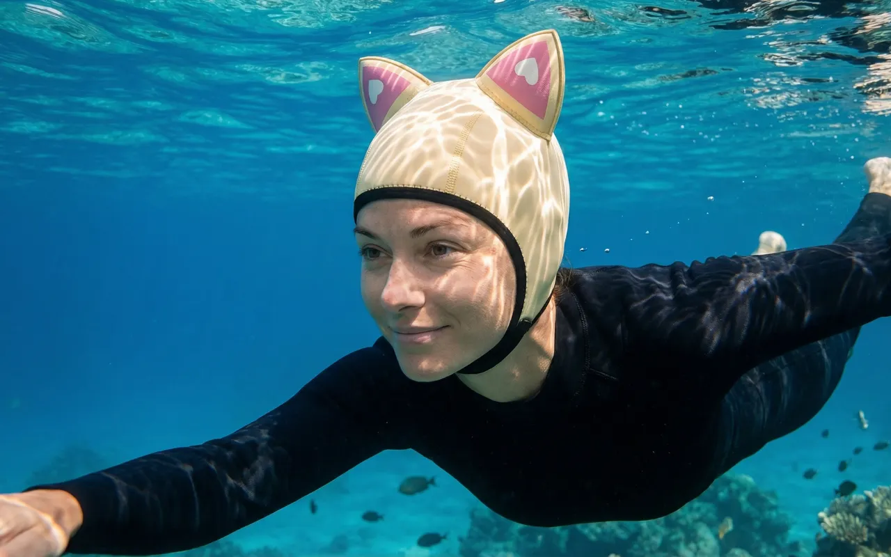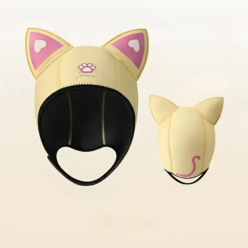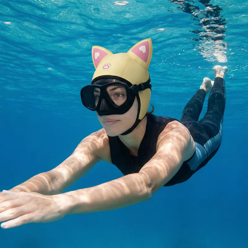 Ei enää sotkuisia hiuksia tai kylmää päätä sukellustuntien jälkeen. Siskoni haluaa myös tällaisen, koska kissankorvat ovat niin siistit!