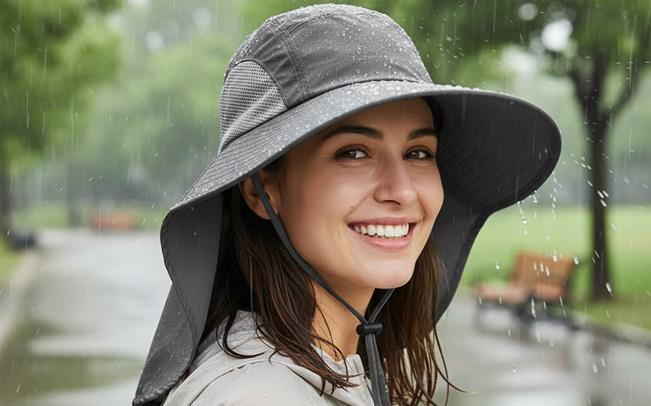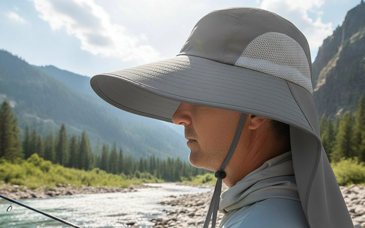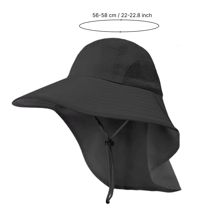 Leveälierinen kangas auttaa estämään voimakkaita säteitä ja ehkäisemään palovammoja. Jatkuva läppä antaa lisää suojaa niskalle ja korville.
