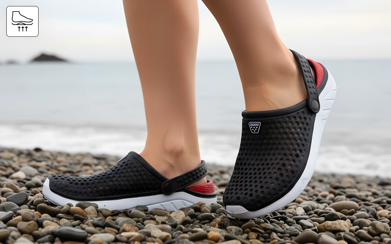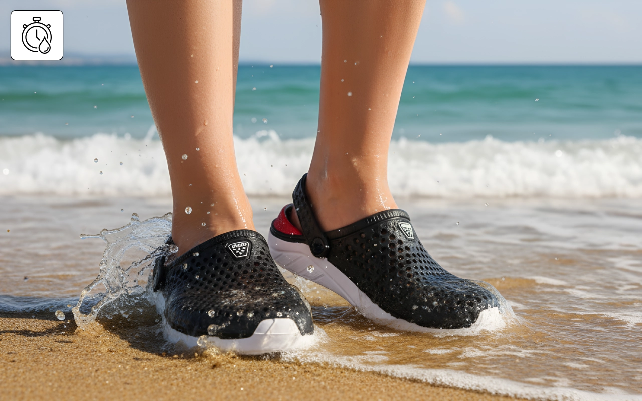Vesi kulkee vapaasti läpi, joten jalat pysyvät raikkaampina pidempään. Ei enää odottelua, että märät kengät kuivuvat leikkien jälkeen.