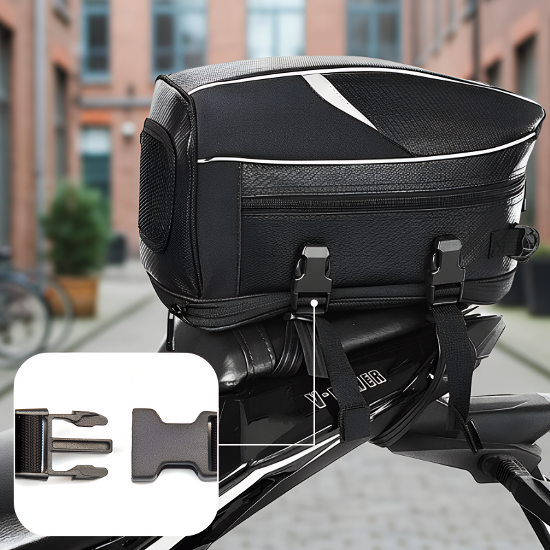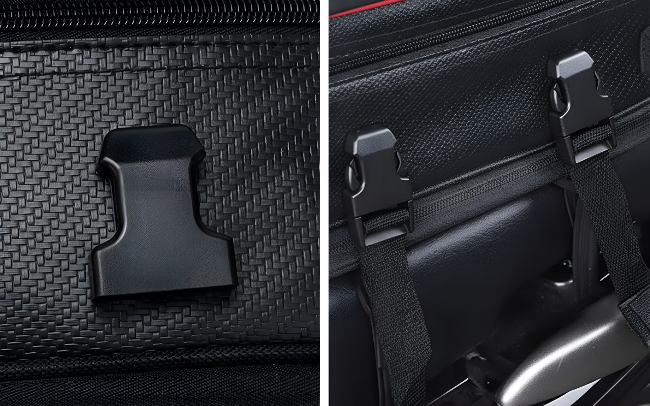 Vahvat kiinnitykset estävät liikkumisen ajon aikana. Laukku pysyy tiukasti paikallaan epätasaisillakin teillä.