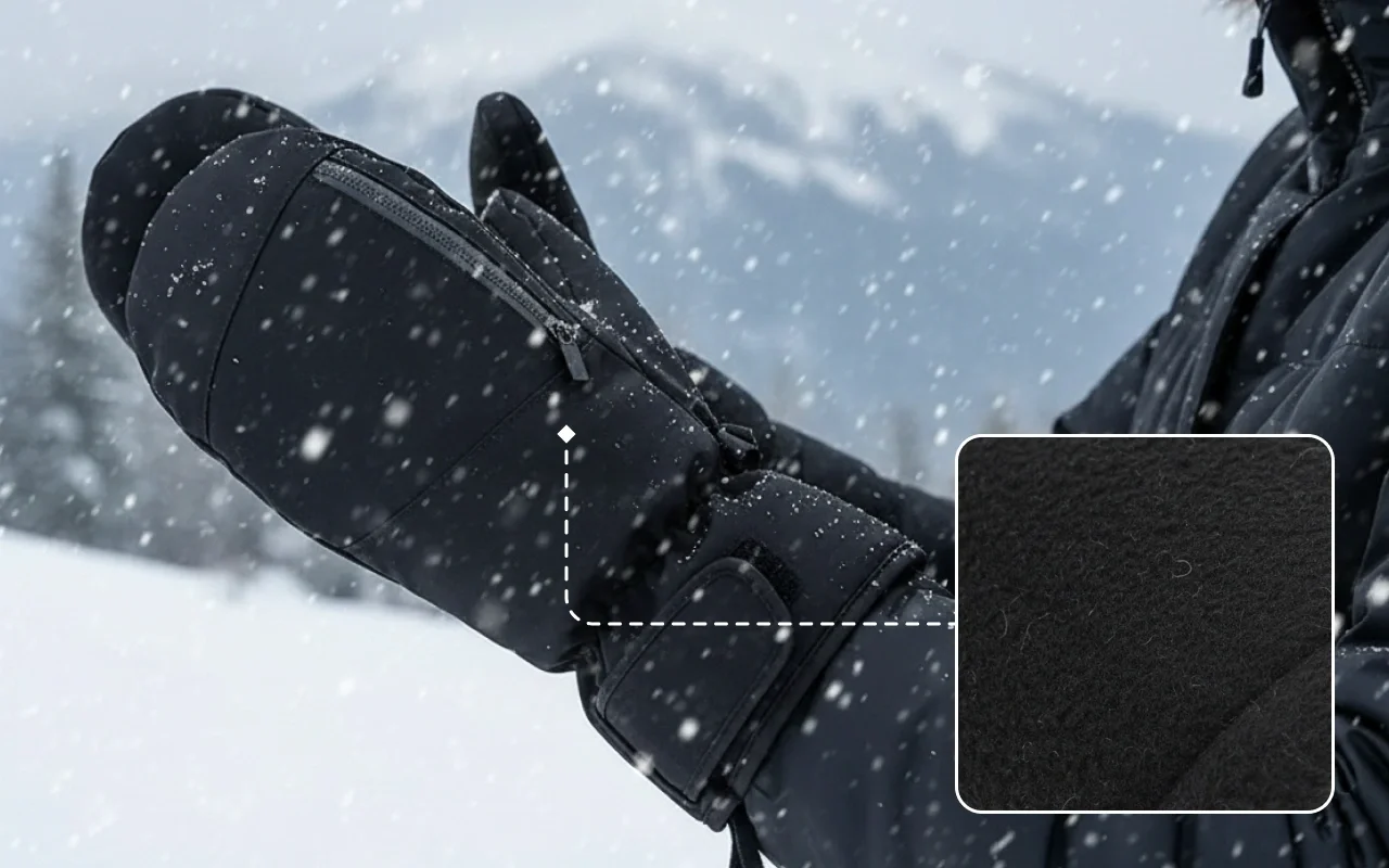 Lämmin vuori estää kylmän ilman pääsyn käsiisi, joten et koskaan palele. Mukava suojaus mahdollistaa ulkoilun lumessa pidempään.