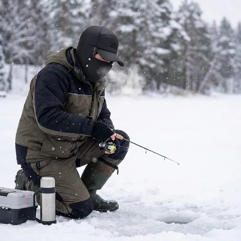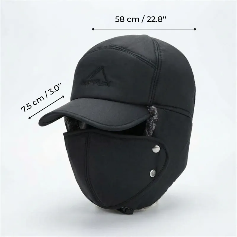 Käytän lakkia pilkkireissulla. Pehmeät läpät pysäyttävät järveltä tulevan viiman ja maski estää kasvoja kipeytymästä. Istuu mukavasti korvien päällä.