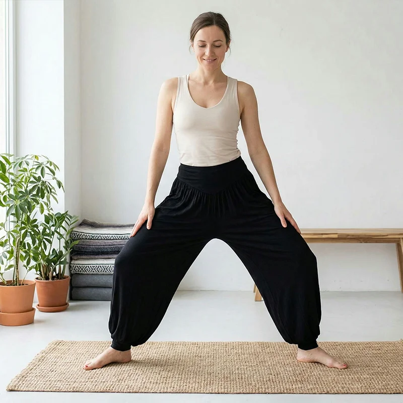Olen tanssinopettaja ja tarvitsin housut, joissa on helppo liikkua. Näissä voin potkia, kiertyä ja askeltaa ilman kiristystä, ja silti ne tuntuvat kevyiltä jalkoja vasten.