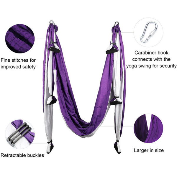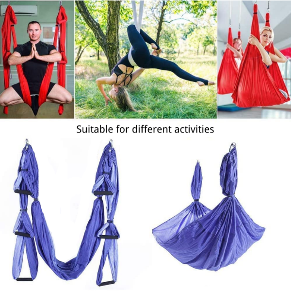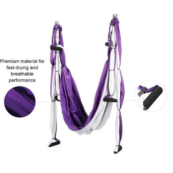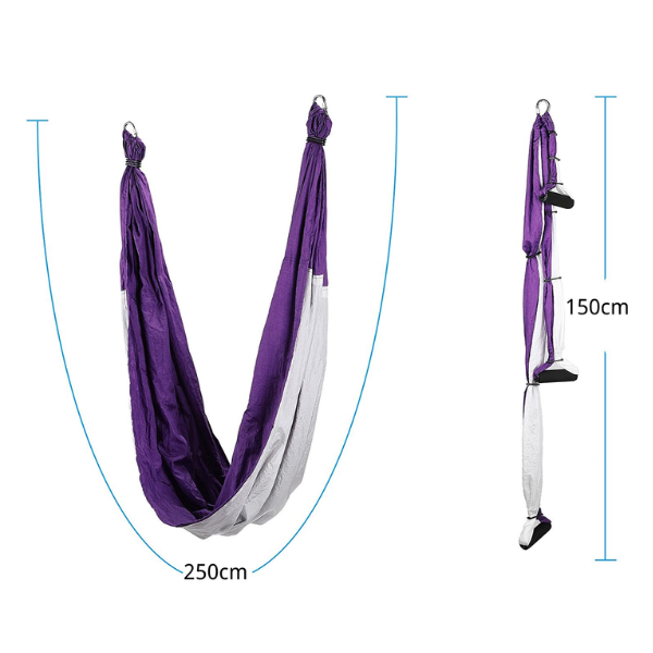 Tämä keinu tarjoaa ammattilaistasoisia terveyshyötyjä koko perheellesi. Se toimii mielialan kohottajana ja stressin lievittäjänä, joten saat sekä fyysisen että henkisen hyvinvoinnin parannusta. Tämä ilmajoogakeinu on valmistettu korkealaatuisesta, vahvasta ja kestävästä laskuvarjokankaasta sekä polyesteritaftasta. Mukana on tukevat kumikahvat, jotka takaavat turvallisen käytön. Kahvoilla on optimaalinen liukumisenestoteho, joka vähentää käsien väsymistä ja estää hikoilua. Ruuvirenkaiden materiaali on ruostumatonta terästä, joka on ruosteenkestävä.